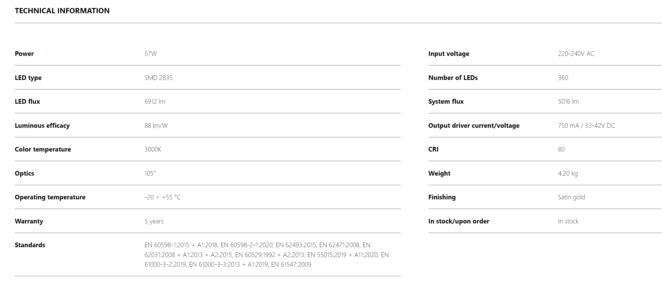 Profil din aluminiu extrudat, vopsit în câmp electrostatic, auriu satinat. Sistem de fixare pe tavan cu patru șuruburi și arcuri elicoidale de siguranță. Sistem de suspendare cu patru fire torsadate din oțel, cu acoperire din silicon transparent, lungimea maximă 2m, cu reglaj micrometric. Elementele de fixare pe tavan și corp vopsite electrostatic, auriu satinat.